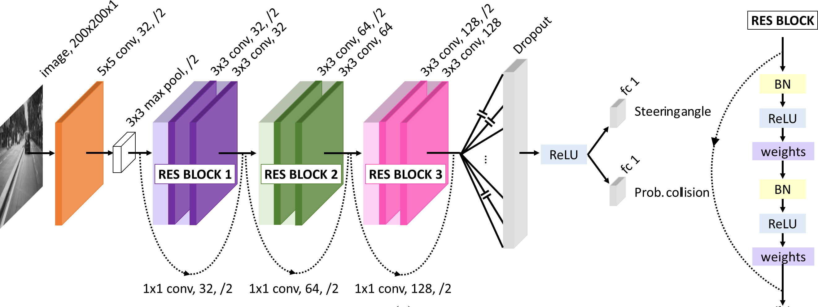 研究人员创建了一个深度神经网络,用于预测转向角,并估计可能发生的碰撞情况。他们使用残差网络(Residual Network)训练神经网络架构,进而生成了用于导航无人机的转向角,并估计了发生碰撞的可能性。无人机可以根据这些估计,识别出危险情况并做出相应的响应。