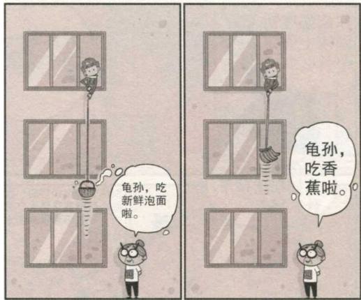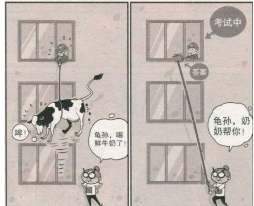 自从无人机被校长给破坏了之后,奶奶就放弃了这种高科技玩意,而是改成了最原始的绳子和杆子!早饭过了一会儿后,估摸着孙子饿了,奶奶就把泡面给泡好,装在篮子里让阿衰给拉上去。孙子该吃饭后水果了,奶奶就把香蕉栓在绳子一短,阿衰慢慢拉上去。为了让孙子喝到新鲜牛奶,奶妈下了血本,直接给阿衰栓了一头奶牛!而考试的时候,阿衰也有了帮手,奶奶将答案放在棍子上,供给阿衰抄写!