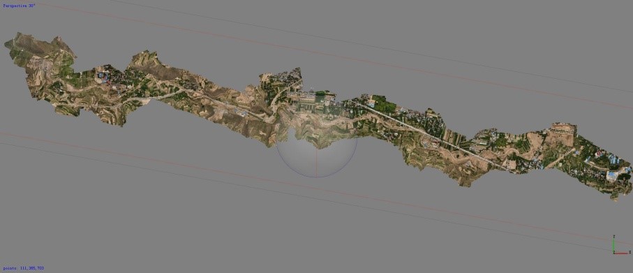 基于天狼星无人机航测系统获取影像的特点,利用Agisoft Photoscan Professional后处理软件,首先将照片影像和高精度POS(Position orientation system)数据导入,基于SIFT(Scale Invariant Feature Transform)算法对照片特征点进行匹配,再根据高精度POS数据对照片对齐,全自动生成密集点云、网格、纹理等,最终得到点云数据(如图2.3所示)、DEM(如图2.4所示)和DOM(如图2.5所示)等数字化产品。