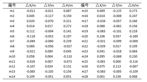 根据表3.1各点坐标较差,计算出各点X、Y和H的中误差分别为0.070m、0.067m和0.136m。可以得出本次项目检核点平面位置中误差为0.097m,高程中误差为0.136m,符合1:2000的成图要求。