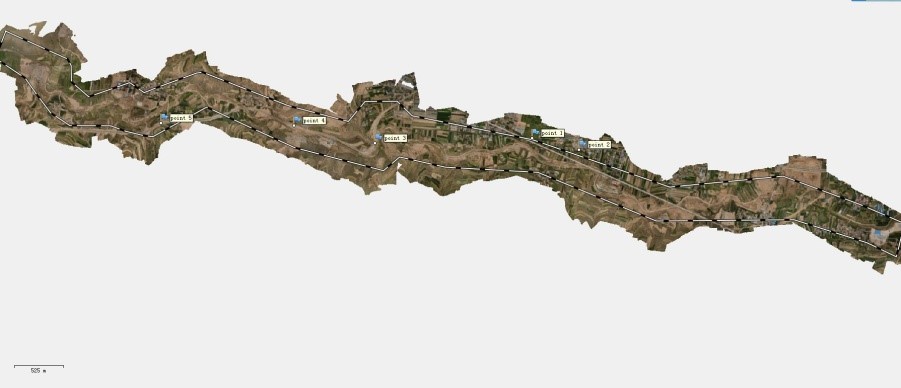 根据河道走向及周边地形的起伏变化,为保障获取高精度的影像数据,确保无人机进行安全作业。本次无人机航线设计中,采用自适应地形变化模块。自适应地形飞行是在Mavinci Desktop飞行控制软件中设置固定飞行高度后,飞机随着地形起伏变化而自动改变飞行高度。固定航高飞行保障飞机拍摄影像过程中照片重叠度,既避免遇到地形凸起时照片重叠度过小,无法满足影像重叠规范要求,又避免在地形低洼处照片重叠度过大,造成飞行浪费。自适应地形飞行可以很好的避免在地形起伏较大的区域撞击到山体等障碍物。如图2.1所示,本次项目飞行航线飞行图。