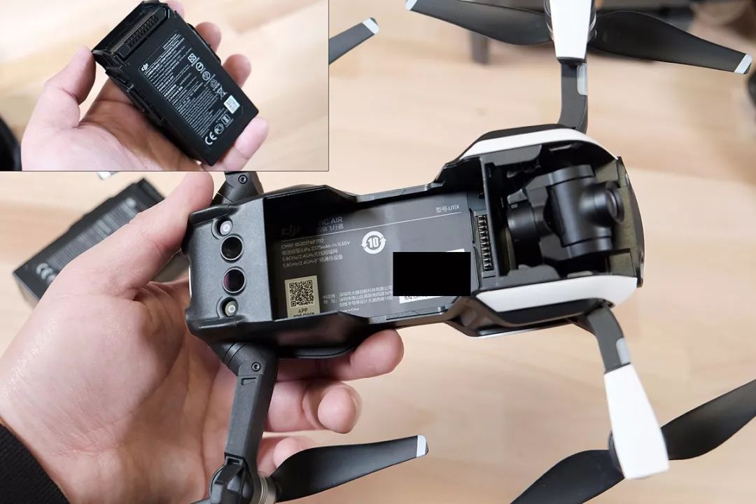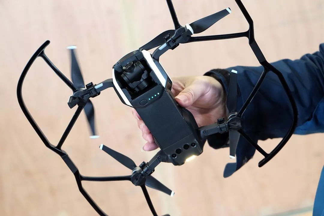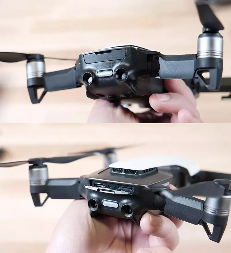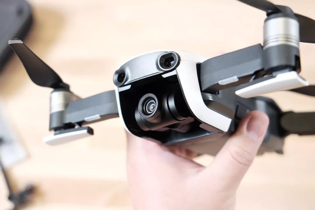 这是大疆Mavic Air的机尾部分,可以看到两个显眼的避障摄像头——这是大疆Mavic Pro也不曾带有的新配置。不过我倒是期望未来大疆无人机能采用类似理光THETA那样的180度鱼眼摄像头,前后各安装一个。它们既可以用来拍摄360度的全景画面,又可以实现前后左右上下的全景式避障...只是不清楚单个摄像头能否做出深度探测功能,或许还得结合谷歌的单摄像头景深技术才行?