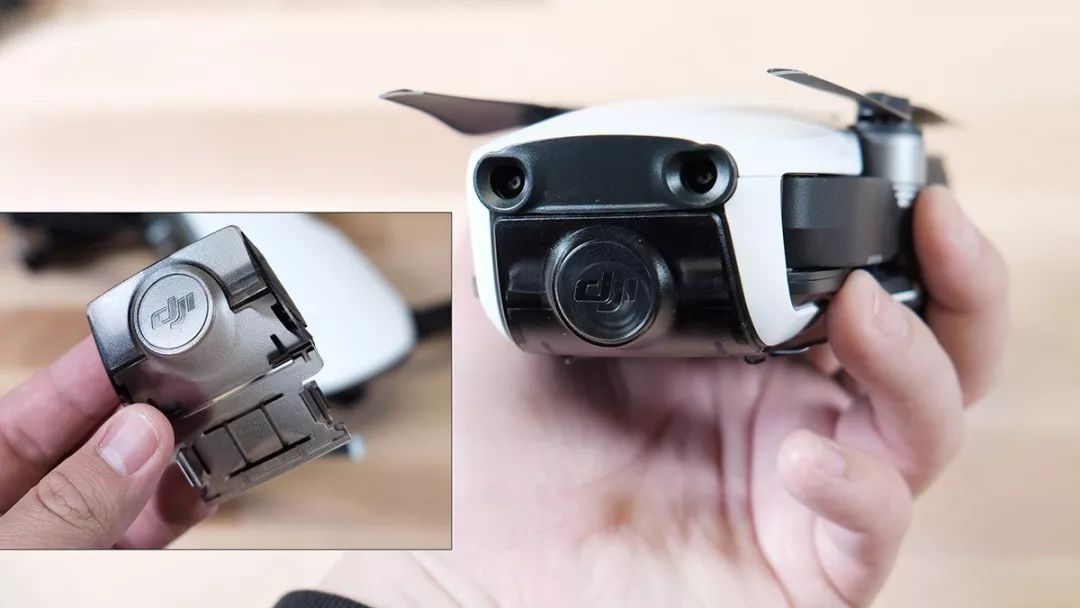 本机2375毫安电池可以支持21分钟飞行,相对如此小巧的尺寸以及新增的后避障功能而言,大疆电池的功耗控制真心一流!本电池不再像Mavic Pro那样放在机背上而是挂在机腹下,通过左右两个锁扣和带有防呆卡槽设计的电池仓来避免电池在飞行中意外坠落。事实上,如果电池不安装好,无人机根本无法正常起飞——这也是大疆在设计上的精妙之处。机身底部的避障摄头和传感器就不再赘述,反正大疆Mavic Air机身虽小但功能如此齐全,确实让其他品牌对手们感到绝望!