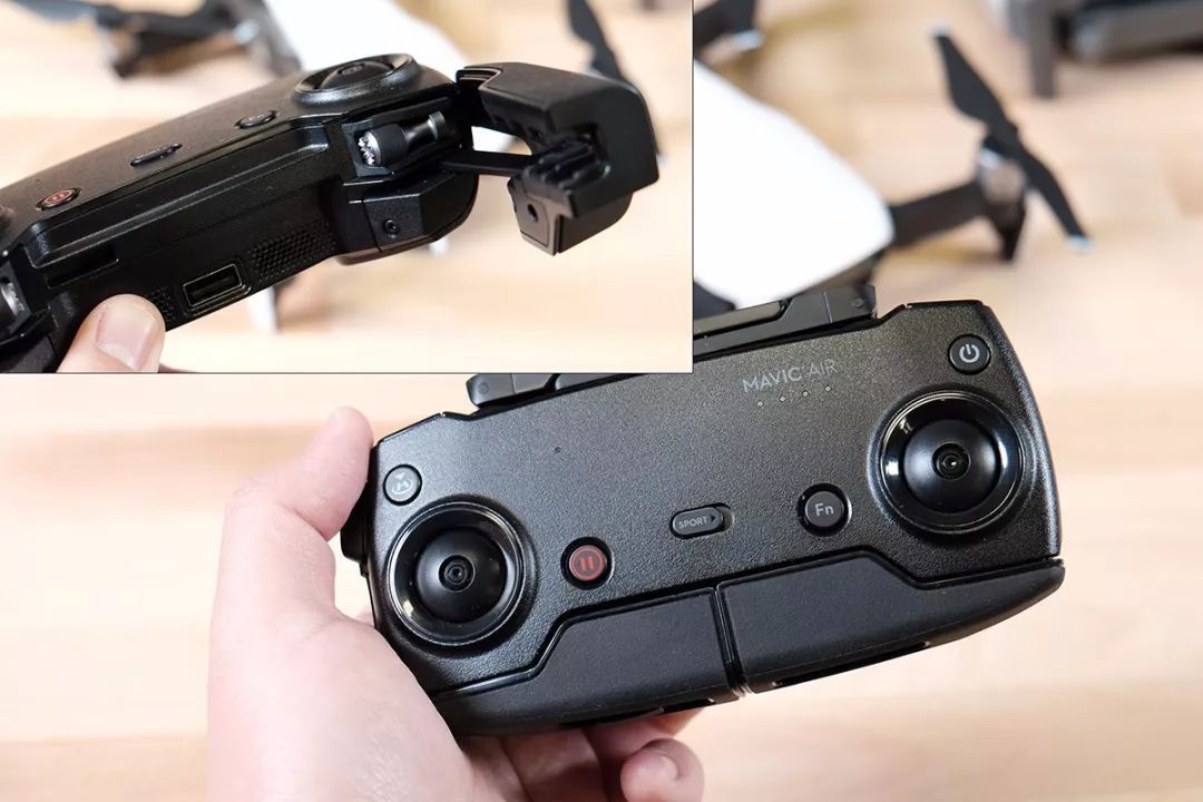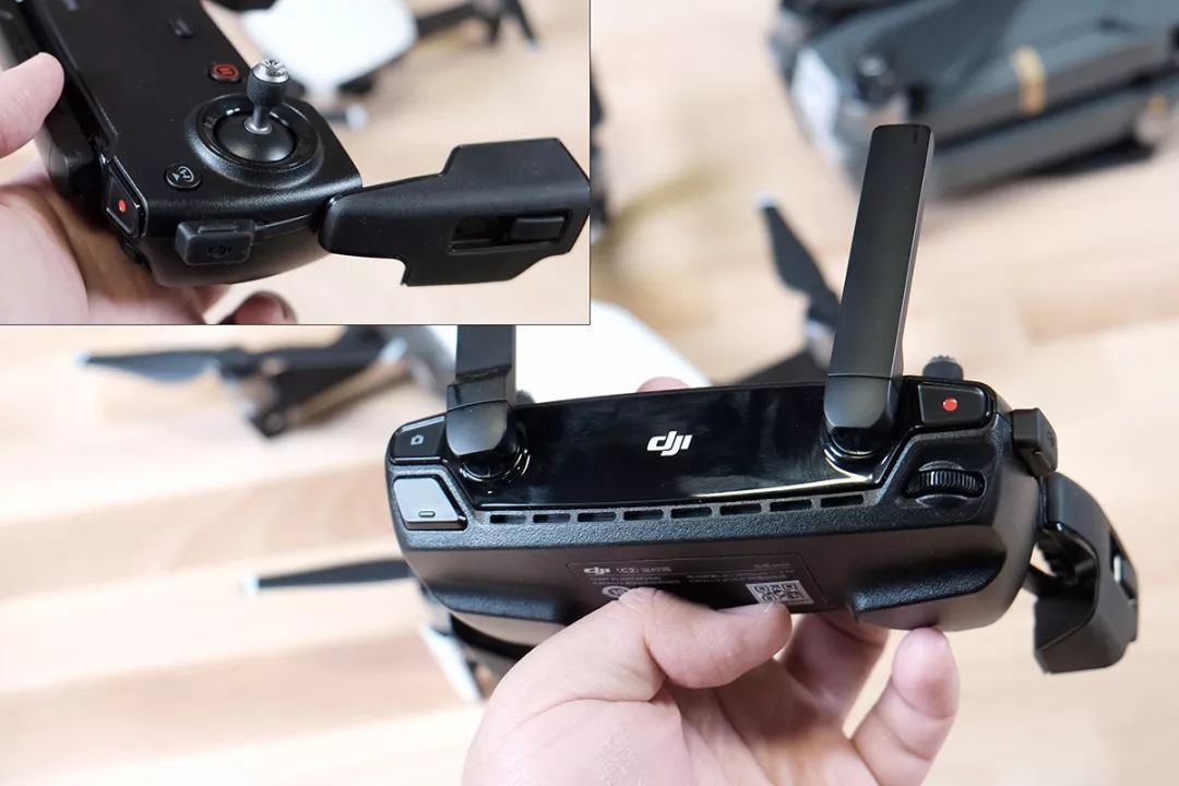 看到网上有评测夸大疆Mavic Air的遥控器如何如何小巧,其实这货和大疆Mavic Pro、Spark的遥控器不是一样大么?!事实上,压缩遥控器体积的“功臣”是那两个可以旋下来收纳于手柄内部的摇杆。过去我因为这两个摇杆,不得不为大疆Mavic Pro的遥控器单独准备一个比较大的独立空间,而现在拆下摇杆后就只需把它塞进屁股口袋里便能带走了!不过,将摇杆从手柄内部取出来再装回去还是要花费一点时间的。另外,我们的包装中有多一套额外的摇杆,不知道这是评测机独有的装备还是大疆为新品促销而特别厚道的准备了两套配件...