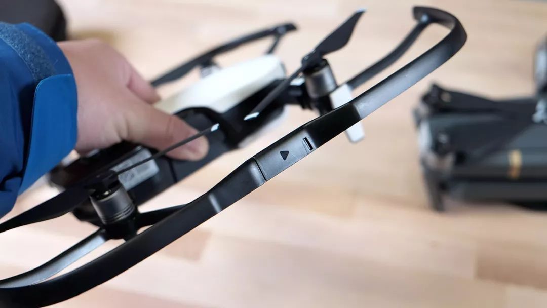 另外,打开机身尾部的盖板可以看到里面的TF卡槽(不插卡也可以拍摄,因为机身自带8GB内存)和Tpye-C的USB接口。想想大疆还是非常与时俱进的,而某些手机大厂迄今为止还是死守MicroUSB不肯松口...对了,机尾上的那个白色LED指示灯实际同时也是一个可以按下的按键,用来启动诸如手势控制之类的功能,可谓一键多能!