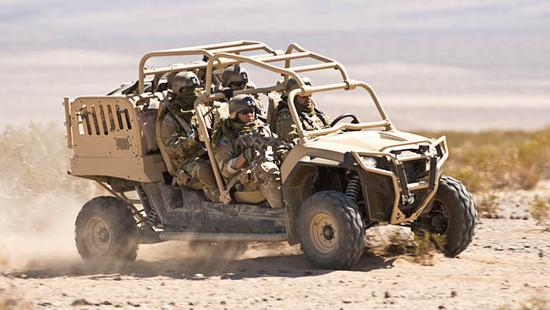 HELWS-MRZR系统中,后缀的MRZR实际是指该激光武器搭载的平台,为美国“北极星”公司研发为美军特战队研发的超轻型全地形突击车代号,该车全重不到5吨,但能搭载680千克货物,而且最高时速可达96公里,可直接使用C-130运输机空投,或驶入MV-22“鱼鹰”倾转旋翼机,随前线部队快速部署。图为美特战队测试MRZR超轻型空降突击车资料图。