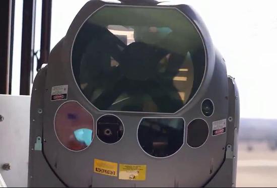 图为雷锡恩HELWS系统转塔视频截图,从外形尺寸上看,与普通光电转塔类似,但中间的大型激光聚焦镜头十分引人瞩目。