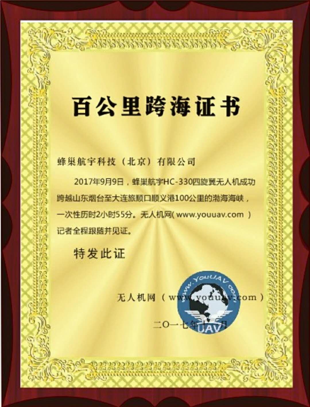 2017年9月9日,蜂巢航宇科技(北京)有限公司(以下简称蜂巢航宇)的混动四旋翼无人机从山东烟台起飞,降落于辽宁省大连旅顺口顺义港,成功跨越渤海海峡,起飞时间11:38,降落时间14:29,总共用时2小时51分钟。飞行距离100公里。正式刷新了2016年英国四旋翼无人机飞行35公里跨越英吉利海峡所创下的世界纪录。