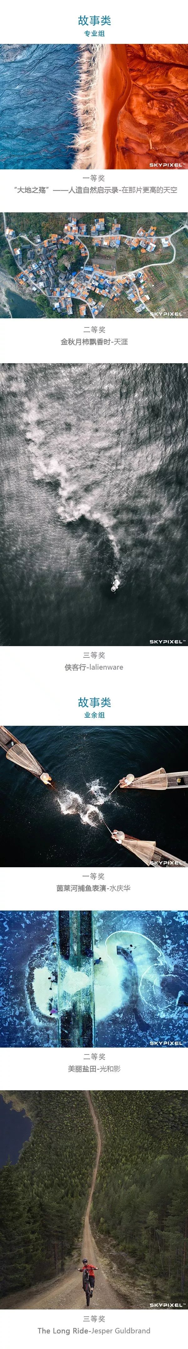 本次大赛新增的“故事”类别也涌现了很多精彩作品。作者展现了堆积如山的共享单车、莱茵河捕鱼表演、香格里拉秘境、安昌水乡古镇的年货街,这些作品从不同角度展现了摄影师们精心讲述的故事。同时,我们也看到了航拍影像更大的可能性——空中视角不仅是瞬间美景,还可以传递和创作出更多令人难忘的故事。中国摄影师拍摄的一组极具张力照片《大地之殇——人造自然启示录》获得了专业组一等奖。