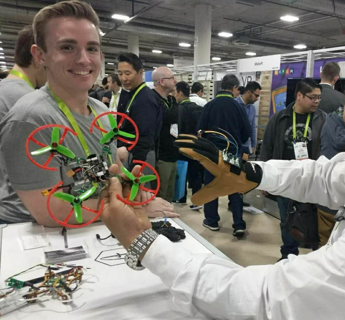 该款产品的特点是通过穿戴式手套和技术的结合运用到人体最为灵活的手势控制上,让人们体验手势控制的乐趣。手套上的每个手指上都安装有传感器,以便捕捉手部动作。这些数据将被有效的用于构建手的3D模型,从而识别用户想用来控制无人机的手势。通过这种方式可以帮助用户更容易学习无人机,并降低控制无人机的难度,培养用户的兴趣和积极性。