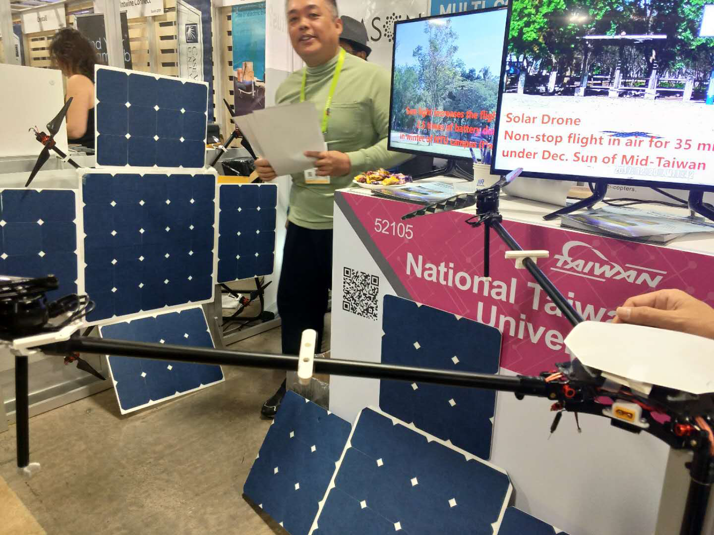 在2018CES国际消费类电子展上无人机网(www.youuav.com)遇见一家做光伏无人机的大学机构。该机构用时不到2年的时间自主研发的这款多旋翼无人机,该机身表面全覆盖太阳能板可充分的吸收太阳能,将太阳能最大幅度的转换成电能。太阳能板本身的重量很轻并且可以进行折叠方便用户的携带,同时整机的重量非常轻从而可以大大的减少能源的损失。据工作人员表示,其在台湾正常的光照情况下进行测试可续航的时间超过了同类型无人机的3倍,可应用到航拍、农业以及测绘等行业。