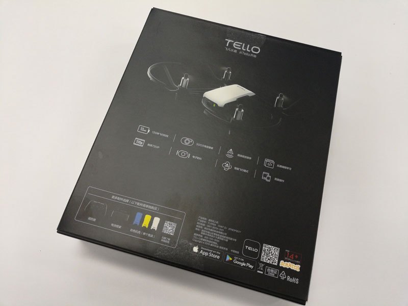 包装盒上还标明这款特洛Tello无人机可以额外的电池管家、蓝牙遥控器和多彩的机壳;