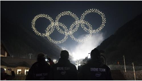 韩媒表示,在空中的1218架无人机非常有秩序的移动排序,无人机如同天上璀璨的星光,组成闪光的运动人体,最后形成光亮的奥运五环标志,呈现在开幕式现场上空。