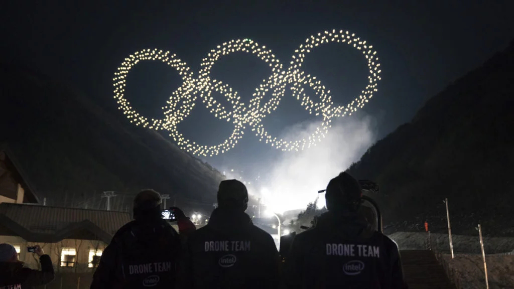 英特尔的射击之星无人机以1218架无人机组成一个奥运五环创造了一个新纪录。