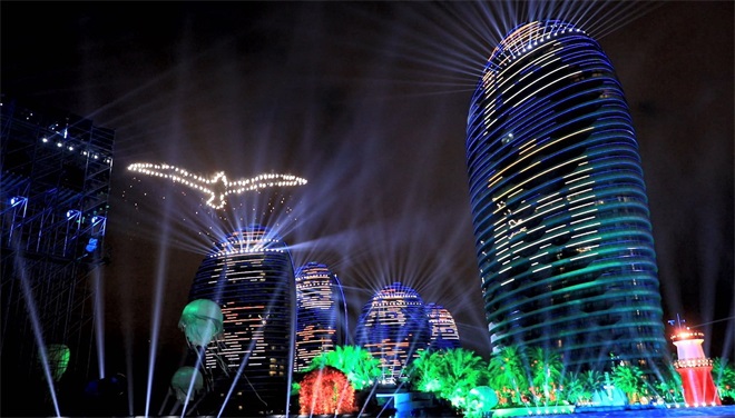 无人机编队在三亚分会场精彩绝伦的表演让观众感到震撼。搭载着电子烟花的100架TAKE无人机振翅齐飞,在变幻成身姿矫健的“海鸥”飞过。转眼,“海鸥”身上绽放着灿烂夺目的火花,仿佛披着一身赤焰,在三亚国际邮轮港的上空呈现出一种火凤凰舞于九天的惊艳效果。
