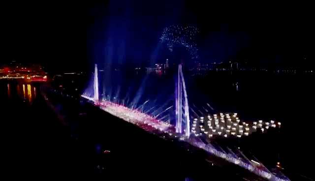 来自云洲智能的无人船在海上编队组成圈,仿佛是海豚跃起时的涟漪,随后无人船变换成“离弦之箭”,与海豚一同越过大桥。来自百度和比亚迪的无人车随着炫丽的灯光、动感的音乐或蛇形或错落地通过大桥。海豚“跃过”大桥后再次变换阵型,在空中组成“新时代”三个字,无人船变换出“启航”二字。“新时代启航” – 为新的一年拉开序幕,展现着中国勃勃生机和无限活力。