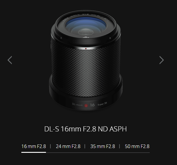 大疆在去年10月推出专业级无人机云台相机禅思X7,这是一款自带APS-C画幅传感器的Super35画幅拍摄设备。和禅思X7一同亮相的还有四枚镜头,分别是DL-S 16mm F2.8、DL 24mm F2.8、DL 35mm F2.8和DL 50mm F2.8,其中三款DL镜头支持全画幅象场。