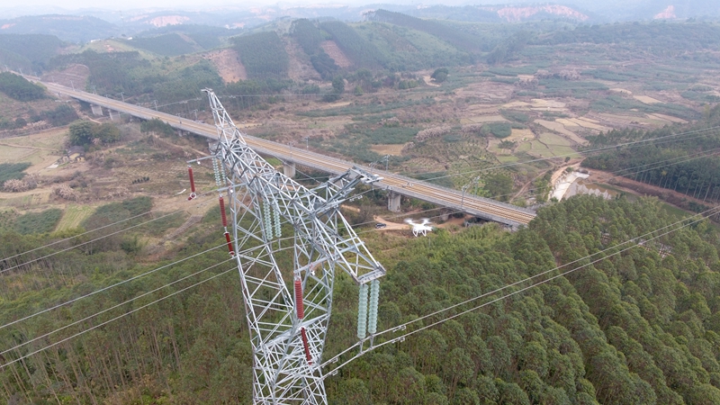 2月10日,几架无人机盘旋在藤县、苍梧范围南广铁路上方跨越的220千伏梧允线和110千伏藤三线等输电线路之上,通过无人机巡视记录下导地线绝缘子及其金具是否存在锈蚀、磨损或断股等情况。