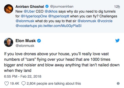 当记者安尔班·戈沙尔(Anirban Ghoshal)替Uber CEO达拉·科斯罗萨西(Dara Khosrowshahi)向马斯克提问,询问他为何专注于开发连接华盛顿特区和纽约的超级高铁系统,而不是飞行汽车时,马斯克将飞行汽车比作是体积和噪音都要大上1000倍的无人机。