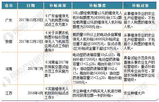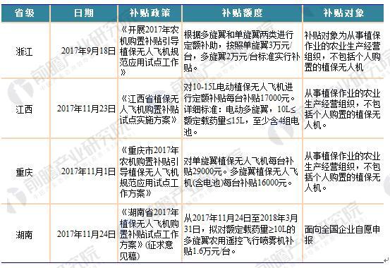 2017年9月,为引导植保无人飞机(亦称农用遥控飞行喷雾机)技术开发和规范应用,助力农业绿色发展,农业部决定2017年选择部分省开展以农机购置补贴引导植保无人飞机规范应用试点工作。统筹考虑相关省份意愿和有关部门意见,选择浙江(含宁波)、安徽、江西、湖南、广东、重庆等6个省(市)开展试点,并发布了《关于开展农机购置补贴引导植保无人飞机规范应用试点工作的通知》。