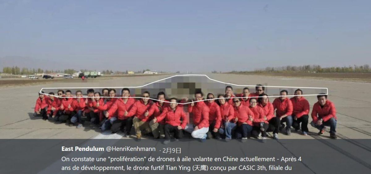 中国的飞翼式布局隐身无人机多个项目并存的现象,也为海外媒体注意到。近日,自媒体上传播着一款名为“新天鹰”无人机的飞行测试成功后的合影照片,照片虽有打码但外形可鉴,应是采用飞翼式隐身布局。有媒体称之为“惊艳世界的新型隐身长航时无人机”。