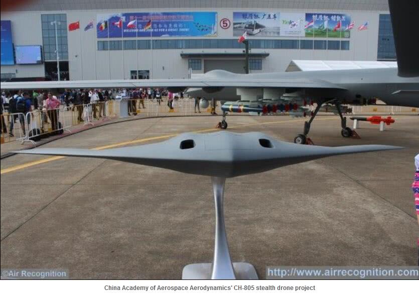 同时,美媒文章作者还注意到上届珠海航展上,航天科技集团展出了CH-805高速隐身飞翼靶机。根据官方介绍,CH-805(彩虹-805)采用飞翼布局,翼展4米,最大起飞重量190千克,续航时间40分钟,具有隐身性能突出(RCS小于0.01㎡)和自主安全飞行等优点,能够用于模拟四代(隐身)战斗机的飞行特性,协助新型对空武器的关键技术验证和战术技术指标考核,也可用于一线部队的实弹演练;可在高速靶机基础上,搭载相应设备,用于集群作战的模拟训练等,能够满足未来一段时间我军对空武器试验和训练的多重需求。