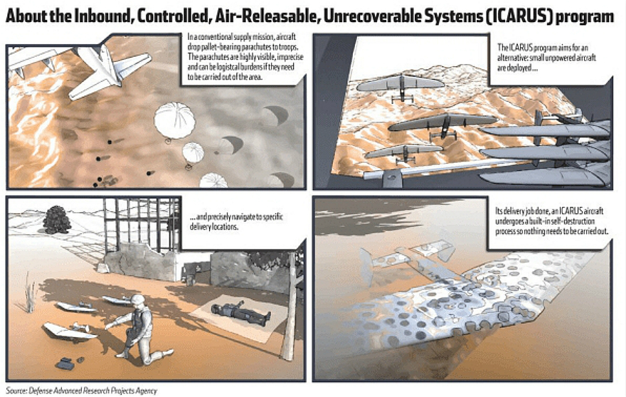 DARPA的第二个自毁装置项目是在2015年开启的,被称为“入站、受控、空投、不可回收系统”(Inbound、Controlled、Air-Releasable、Unrecoverable Systems ,简称ICARUS)。该项目的目标是开发可执行战场任务的无人机,并在任务完成后“人间蒸发”。
