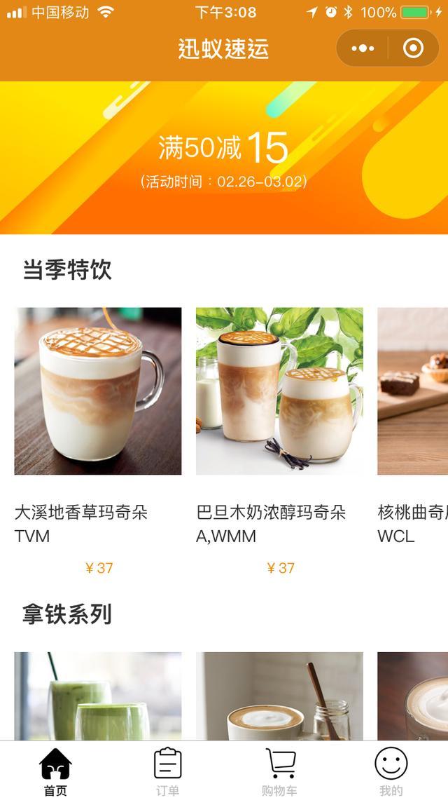 下单用的是微信上的一个小程序——迅蚁速运。操作很简单,选择你要的咖啡、配送地点、配送时间。