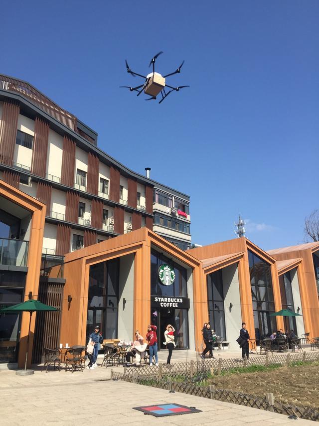 我在距离这家星巴克空中飞行距离2公里的恒生科技园,打开手机点了一杯,无人机起飞10分钟后就喝上了,咖啡还是暖呼呼的。