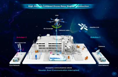 无人机高空基站由系留无人机和通信基站设备组成,是一种全新的应急通信手段,能够在地震、洪水、泥石流等自然灾害发生,大面积通信中断的情况下,快速恢复现场通信,解决紧急场景下的移动信号覆盖问题,有效地提高中国移动面对自然灾害时的应急通信保障能力。