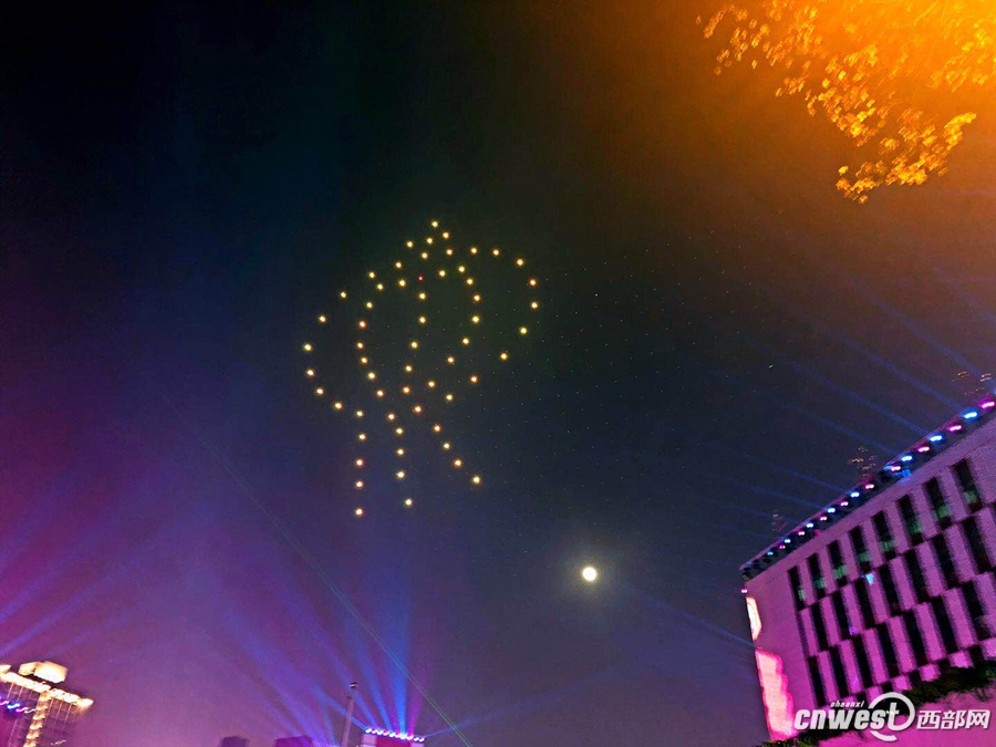 在音乐的变化中,空中的500架飞机又依次组成“国际创新”和“硬科技”这两个极具“西引力”的西安关键词,同时代表高新区前沿科技的机器人和火箭图案轮番闪耀夜空,向现场观众展示西安“硬科技之都”科技创新的独特风采。
