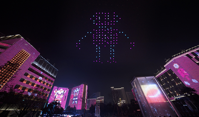 亿航白鹭20多位工作人员,历经2个月的脚本打磨策划、通讯网络优化、反复彩排测试,将500台无人机分为多组并行任务,采用高精度的RTK-GPS载波相位差分技术为每台无人机提供厘米级精准定位,并充分利用了高亮多彩动态感灯光效果强化了造型的透视感和立体效果,从而呈现精彩的空中视觉盛宴。
