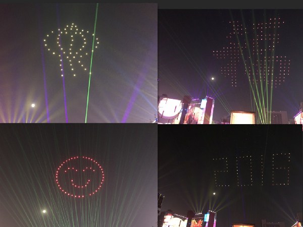 与此同时,“天空舞台”与“地面舞台”交相辉映,一幕幕声光电大秀和着音乐律动的节拍,让西安创业咖啡街区从楼宇、天桥再到光立方与天空中的无人机共同脉动,也让在场观众的心一起脉动起来。随着时光隧道逐渐消散在夜空,“我爱西安”编队篇章拉开帷幕。无人机在空中形成巨大的笑脸图案,而另外一组无人机则依次组成了“I ❤ Xi’an”以及钟楼、大雁塔的地标建筑图案造型,展现出西安人民的热情好客的一面,也让在场观众心中的自豪感油然而生、自豪不已。在音乐的变化中,空中的500架飞机又依次组成“国际创新”和“硬科技”这两个极具“西引力”的西安关键词,同时代表高新区前沿科技的机器人和火箭图案轮番闪耀夜空,向现场观众展示西安“硬科技之都”科技创新的独特风采。在“欢乐中国年”篇章中,无人机形成“元宵”、“福”字、“2018”、“西安年”等新春元素,更是把元宵佳节灯光大秀的喜庆气氛推向高潮。而当500架无人机从夜空中徐徐飘落,整个夜空星光点点,预示着2018年西安迎来更多的创新与收获,西安百姓的生活幸福美满。