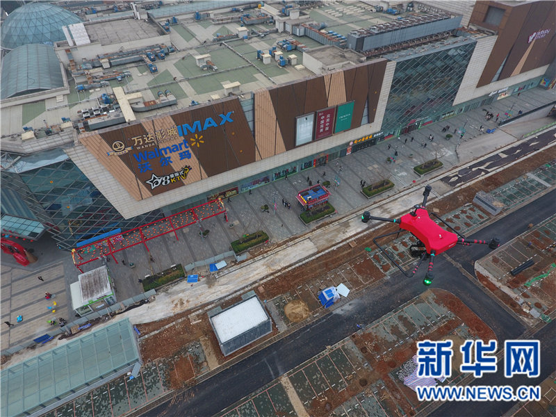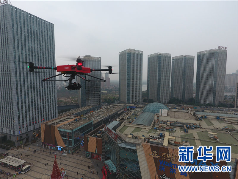 无人机对经开区万达广场及周边区域进行空中巡查。