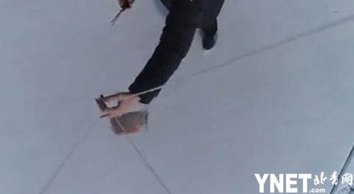 视频中可以看出,面包被绳子系在无人机上,在空中飞行了一段时间后被送到一户人家门前,主人出门用剪刀将绳子剪断,取得了面包,并对无人机挥手再见。
