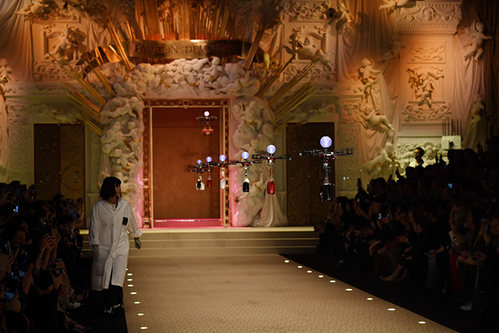 每架无人机的“头上”都嵌着一块宝石(当然,宝石是假的),格外夺目。它们排成一队,缓缓滑下跑道,有序地悬停在空中让观众们拍照。表演结束之后,传统的真人模特秀才正式开始。