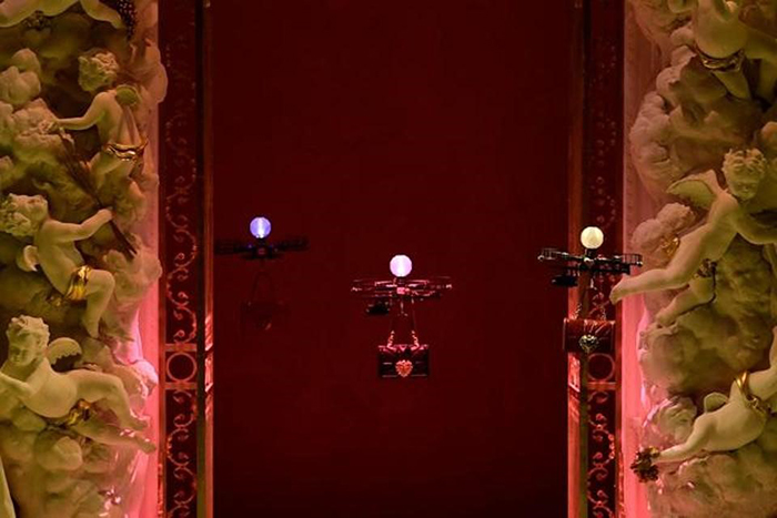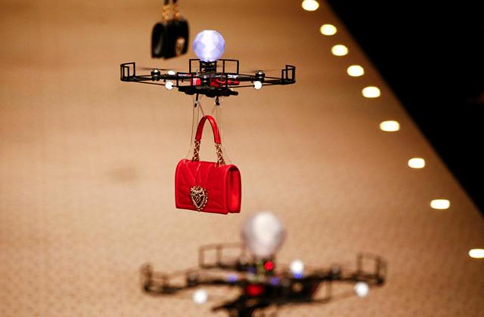 上周六,Dolce&Gabbana使用无人机携带其最新款式手袋出现在‘Secrets & Diamonds’晚装活动的秀场舞台上。当晚大约有七架无人机出现在T台,每一架都搭载了该公司最新的2018/19秋冬女装系列的皮革和镶嵌珠宝的手提包。款名均为Devotion,并配有心形LOGO(图案)的封盖。