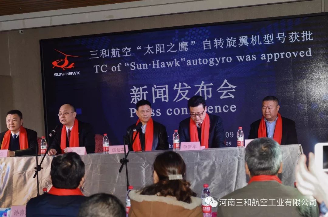 2018年2月9日,我公司“太阳之鹰”自转旋翼机型号获批新闻发布会在郑州通航试验区隆重举行。邀请到会的领导嘉宾分别有河南省通航协会会长焦建新、郑州市上街区区委副书记李新军、郑州市上街区副区长阎胜、郑州市通航试验区管委会副主任孙喜忠、各区职单位及试验区企业和新闻媒体单位。