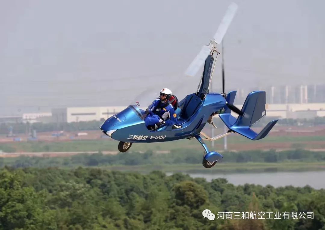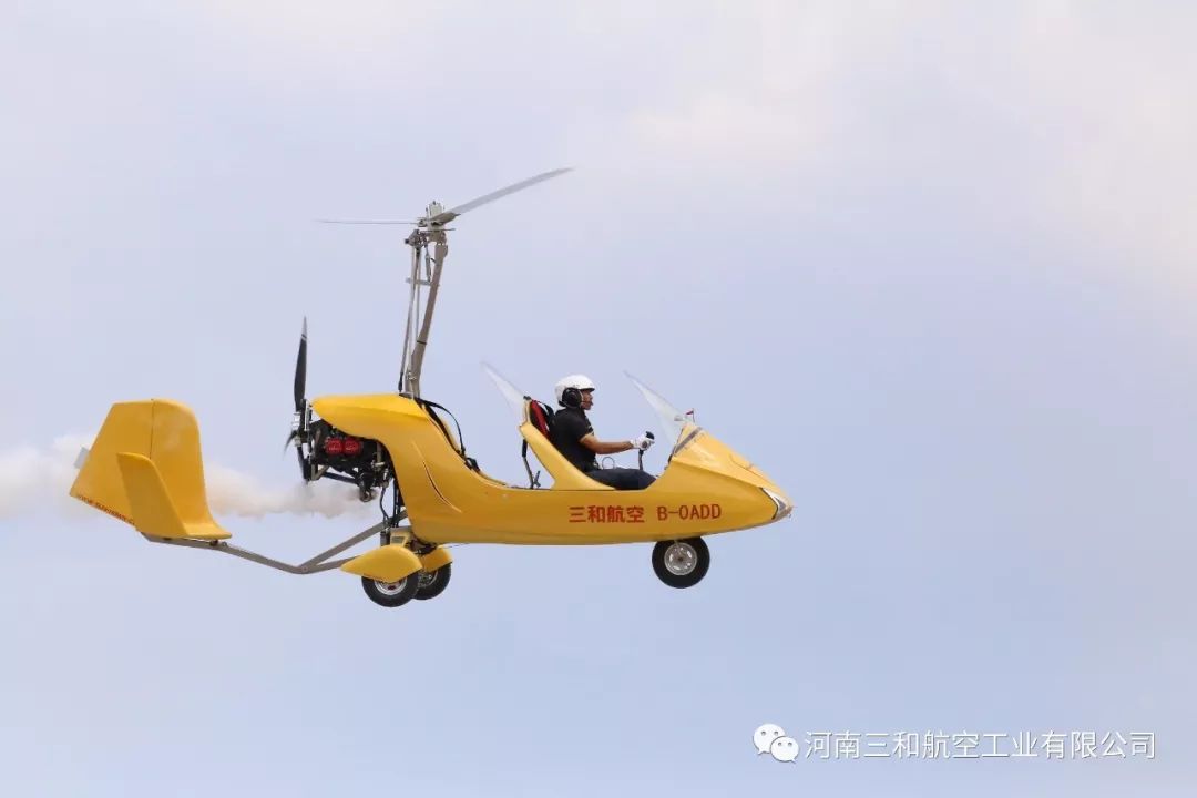 “太阳之鹰”自转旋翼机是三和航空自主研发的开放式座舱,前后串列的双座旋翼机,其特点是旋翼本身无动力驱动,而是靠由独立于旋翼系统的发动机驱动的螺旋桨产生向前的推进力,使旋翼在空气作用下产生自旋,进而产生升力,由于旋翼机的旋翼旋转的动力是由飞机前行产生的来流而获得,万一发动机在空中停车,此时旋翼机随惯性继续维持前飞,并逐渐下降高度,这样,旋翼机便可凭飞行员的操纵安全地滑翔降落。