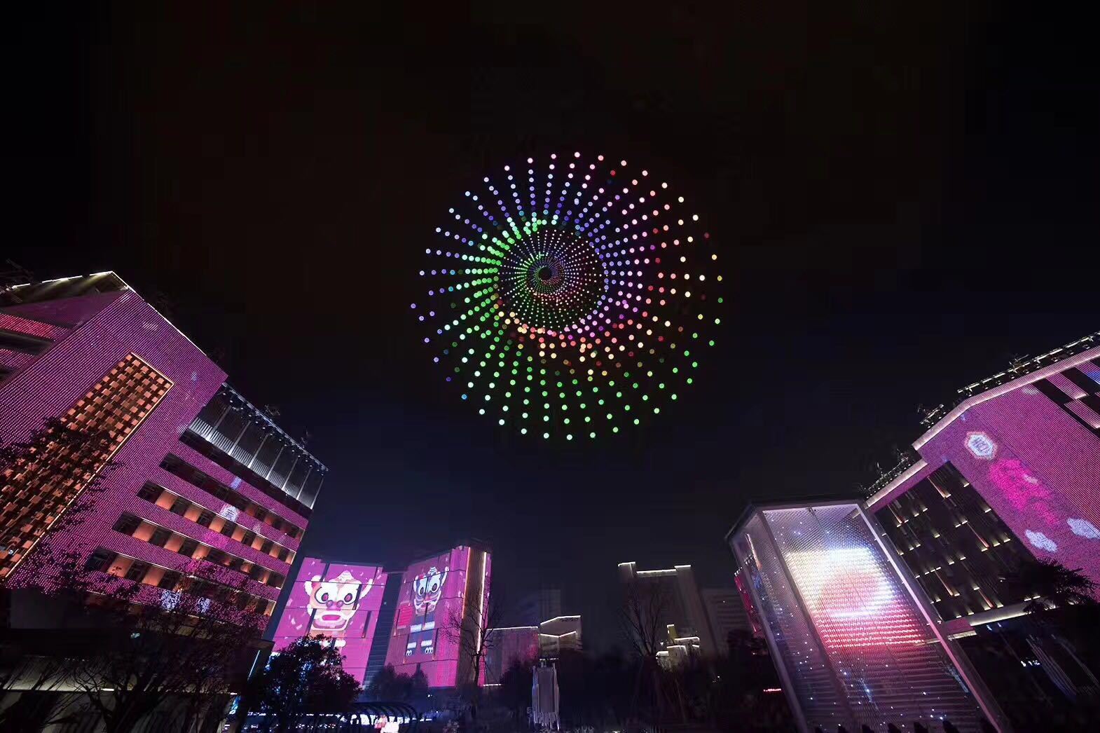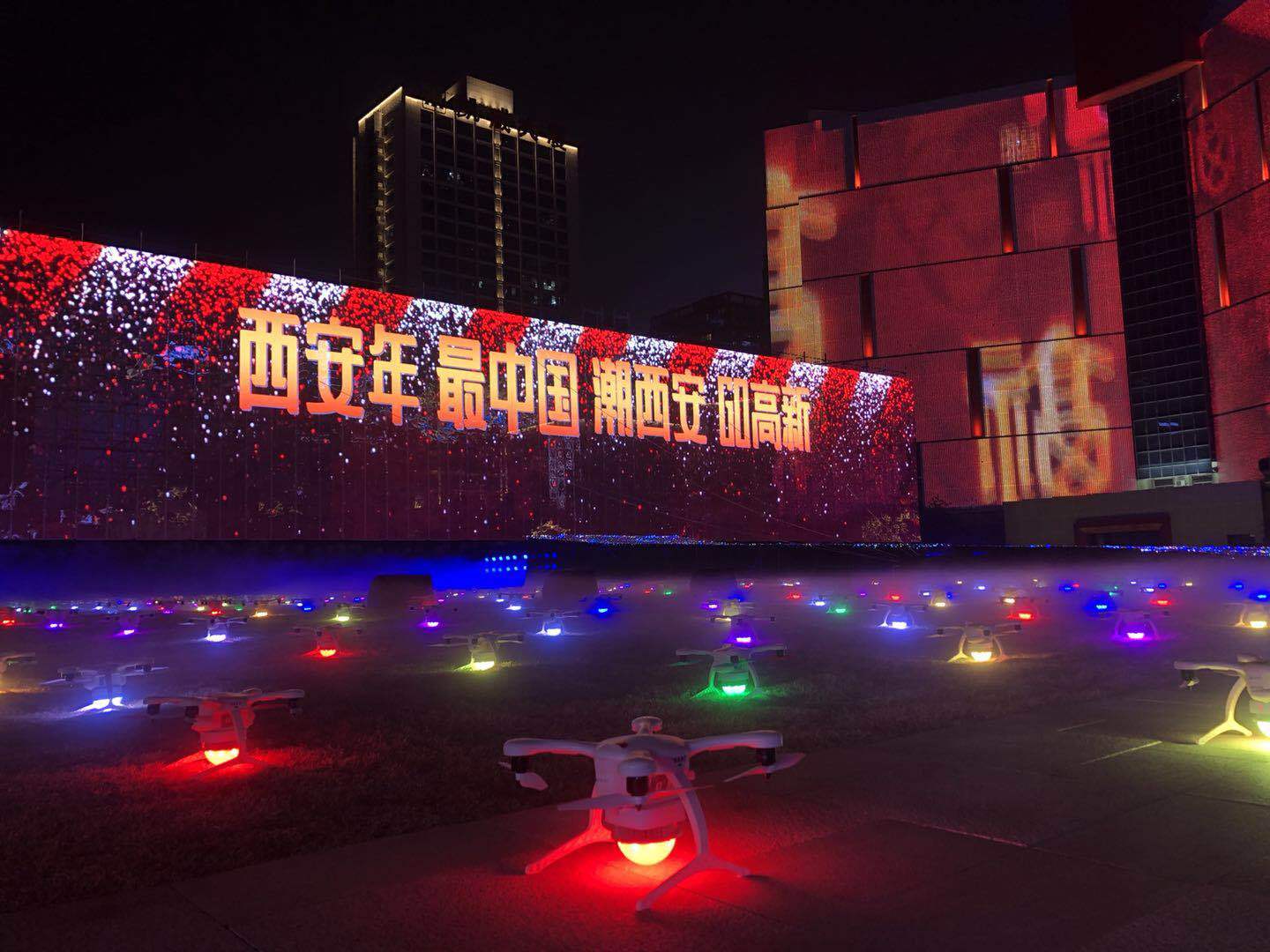 作为全球首创无人机空域造景媒体、吉尼斯世界纪录创造者、“中国智造”的代表,亿航白鹭去年12月曾在广州《财富》全球论坛上表演了“千机變”天幕光影show惊艳世界,此次表演别出心裁地用了古典乐曲中分段乐章的形式进行,分为“时光隧道”、“我爱西安”、“硬科技之都”、“西安年·最中国”、“瑞雪兆丰年”5个篇章,空中表演的同时加入地面演员表演以及动感灯光秀,更创新性地突破了以往二维平面点阵无人机编队模式,首次实现3D立体编队造型,让360度不同角度的现场观众都能欣赏到别样的光影风景,带领观众穿越古今,回望盛世长安,展望高新西安。楼宇间光影变幻绚丽多变,激光柱辉映交织动感律动,与夜空这幅长200米、高150米、宽84米的星幕画卷交相辉映,陆空同舞!西安创业咖啡街区成为了灯火最美的海洋、气氛最燃的现场!