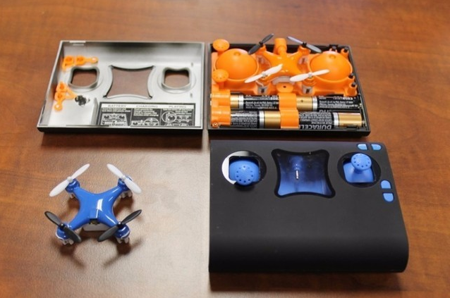 据悉,该无人机的尺寸非常小巧,长度仅有40mm,加上手柄以及电池组的整套盒子也跟手机的大小差不多,但是要比手机更厚一些。不过,它配备了6轴陀螺稳定装置,可以获得更加稳定的飞行效果。