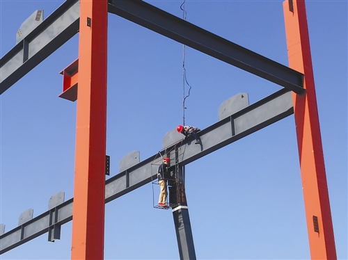 在航空材料试验车间建设现场,四周毫无遮挡,即使天已放晴,风刮在脸上仍有痛感。在13米高空处,五六位钢结构安装工正在矫正、固定钢架。中午时分,来自安徽的尹家威下到地面休息,他脸色通红,腿也因长期保持一个姿势而有些麻木。