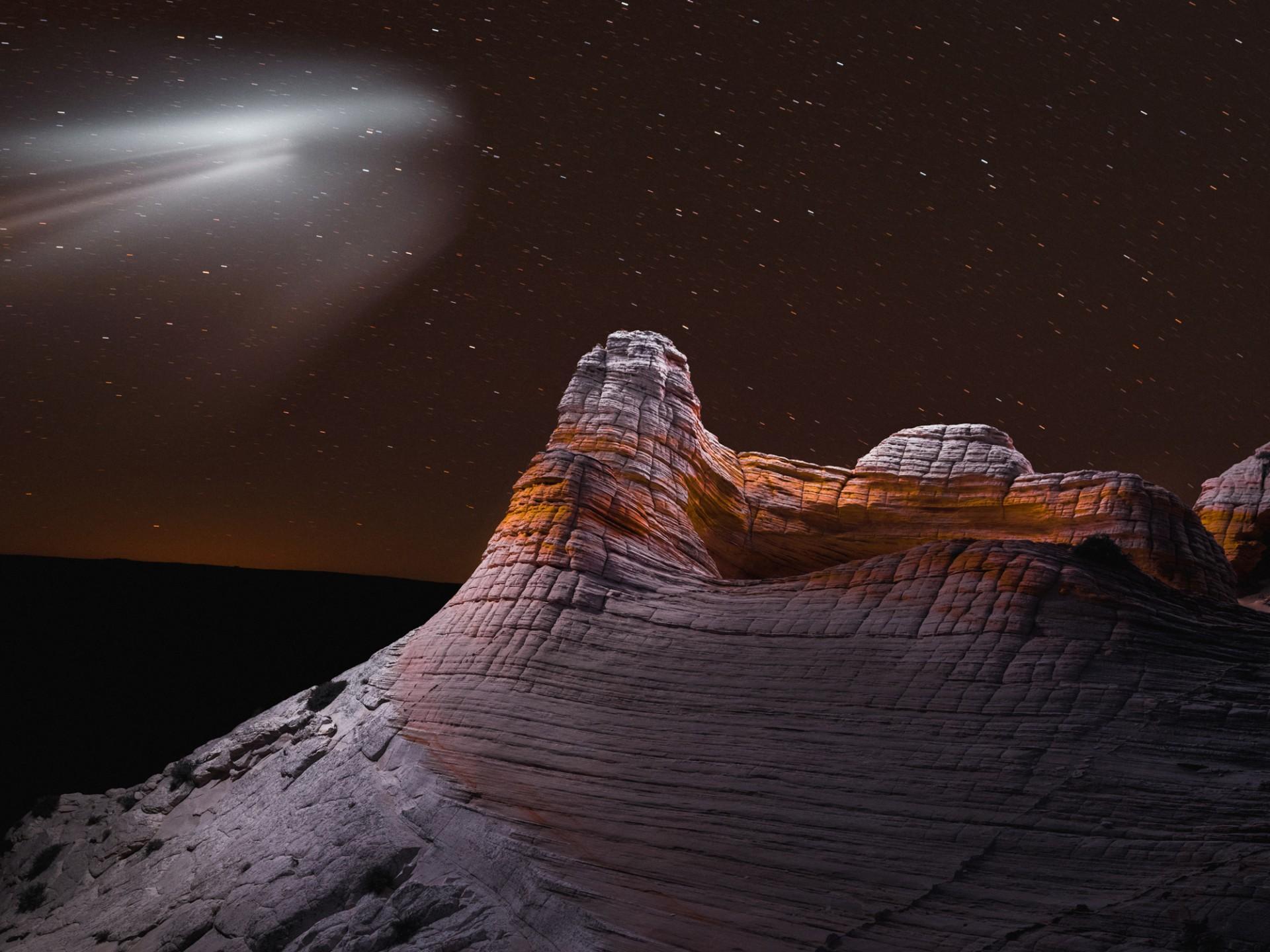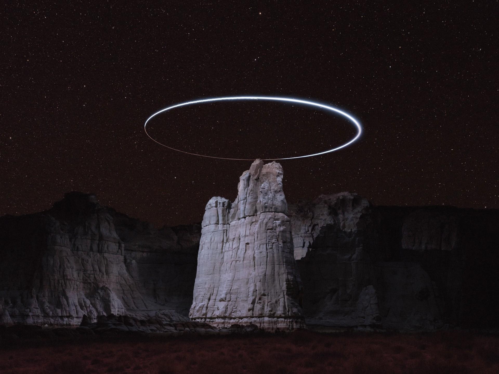 这正是因为拍摄的光亮是无人机提供的,所以长时间曝光的照片,捕捉到无人机的痕迹,宛如给每一座山石套上了光环,异常美丽。