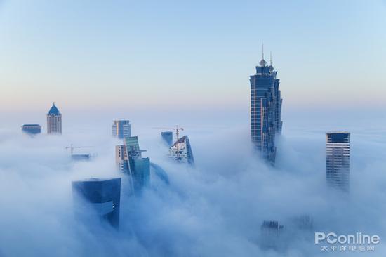较低的平流云会掩盖住比较高的建筑顶部,好像变魔术一样。这时候可以用无人机在远处空旷的地方起飞,穿过平流云,就可以看到被掩盖住的建筑,这时候就能拍一张海市蜃楼般的航拍作品。