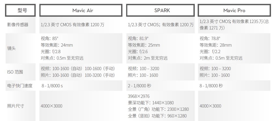 摄影摄像部分,个人总结是Mavic Air与Mavic Pro属于同级别,互有胜负。如果你是视频拍摄为主,个人更推荐MavicAir,具体参数差异整理了一个表格给大家查阅。