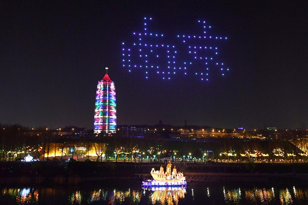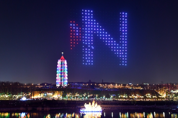 灯光秀在大报恩寺遗址公园上演,400架无人机在电脑程序的控制下在空中摆出各种造型,点亮南京夜空。