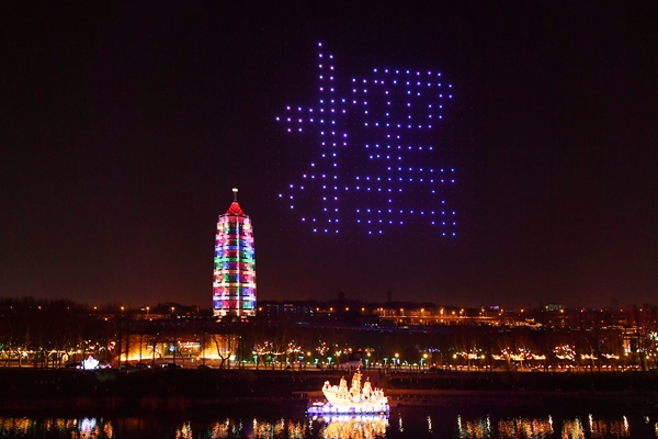 2018年3月13日晚,南京首次大型无人机灯光秀在大报恩寺遗址公园上演,400架无人机在电脑程序的控制下在空中摆出各种造型,点亮南京夜空。