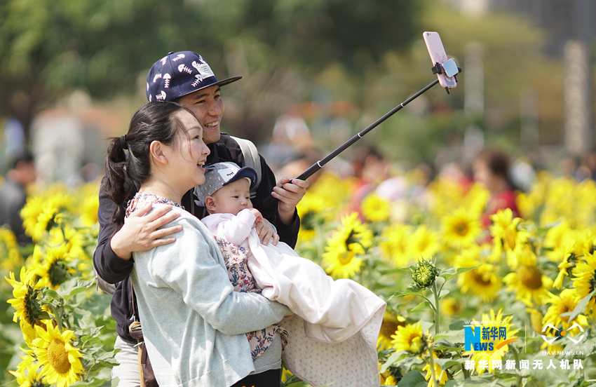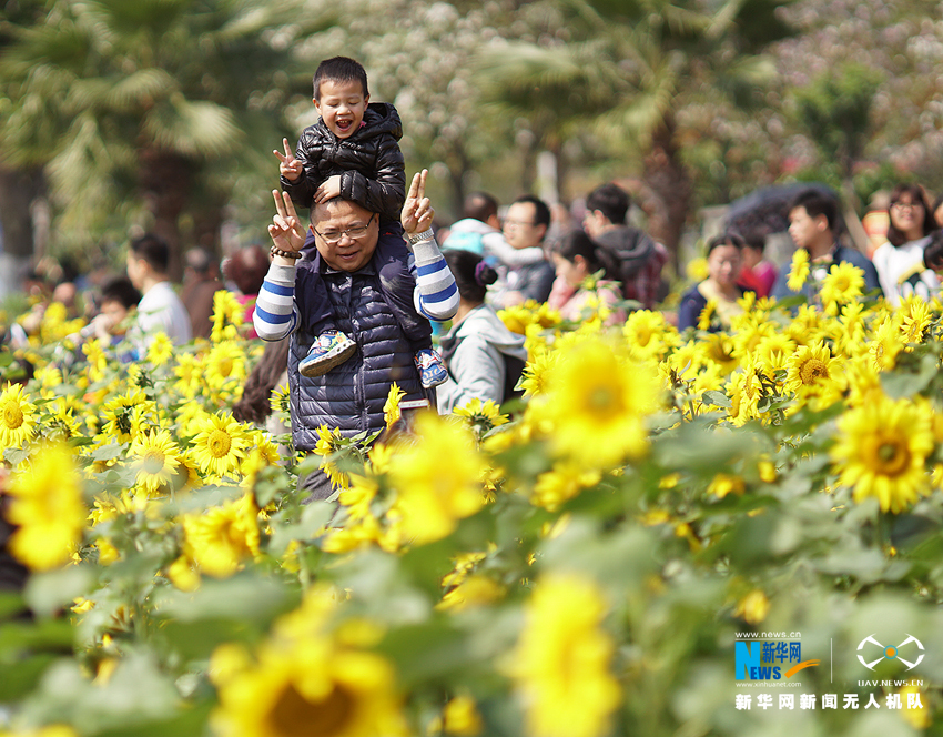 3月11日,春光明媚,在佛山市南海区的闹市中心,市民在向日葵花海中徜徉。新华网发(龙上淳摄)