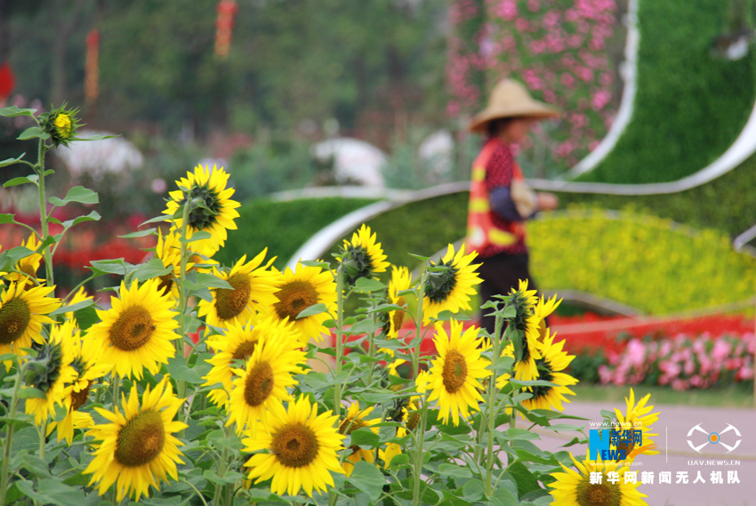 广州海心沙广场,一名园林工作人员从向日葵花海前走过。新华网记者崔凌云摄