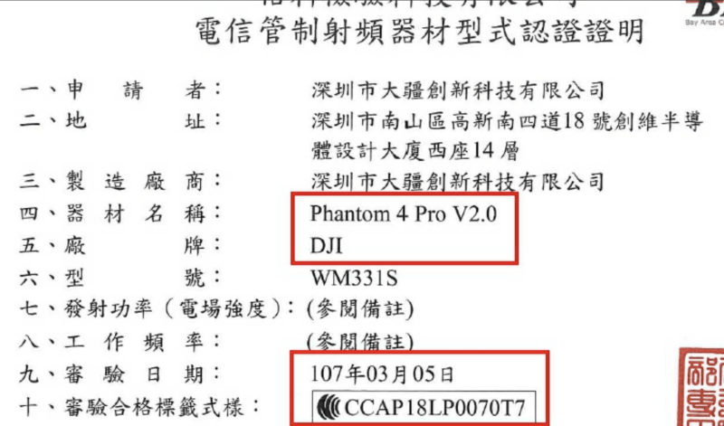 在网上流传的图片显示,DJI 为Phamtom 4 ProV2.0 申请「电信管制射频器材型式认证」。其中审验日期以(民国) 107 年 03 月 05 日所示,估计这是 DJI 向台湾当局递交的申请。